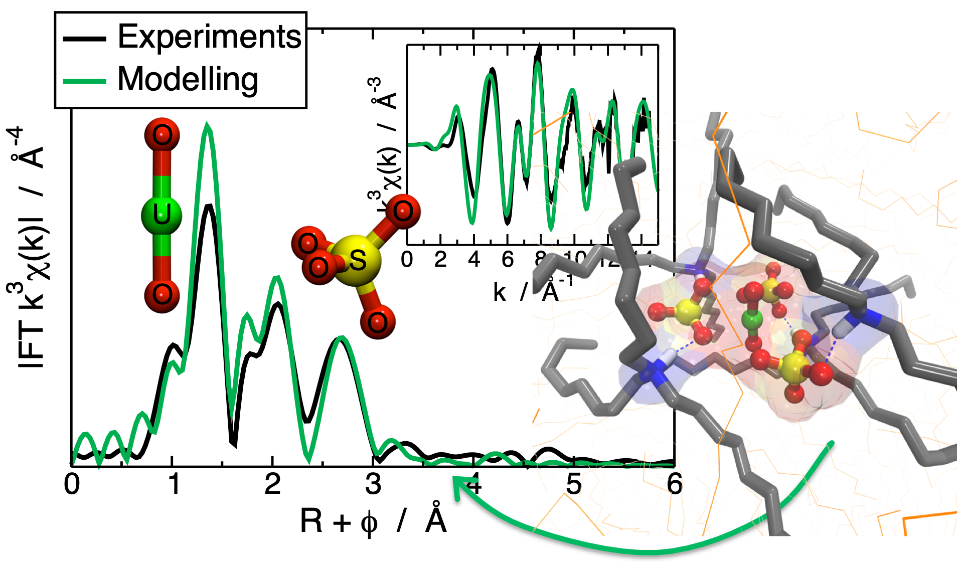 Coupling EXAFS with MD simulations for uranyl extraction in sulfuric media with tertiary amine extractants enabled unravelling of the unprecedented uranyl tri-sulfate structure.