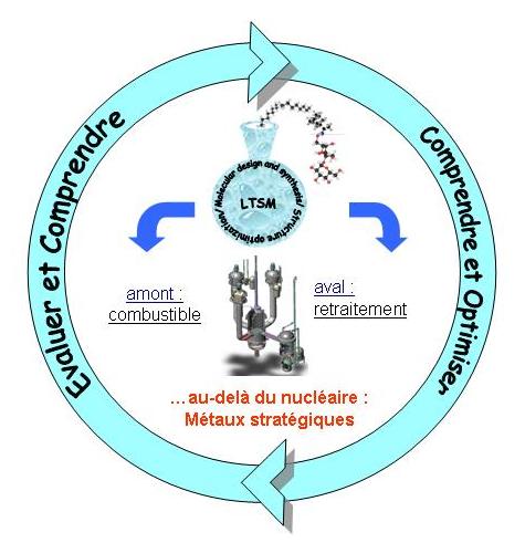 Le « tri ionique » est l'un des problèmes majeurs associé aux technologies de production d'énergie, nucléaire ou alternative, depuis l'extraction minière jusqu'au traitement des combustibles usés, dans un souci permanent de stockage sécurisé des déchets ultimes et de recyclage des espèces valorisables. Tous les matériaux mis en jeu contiennent des métaux qu'il est nécessaire de séparer, après dissolution, de manière à réaliser « la fermeture du cycle du combustible ». Le LTSM met ainsi sa compétence en synthèse organique et son savoir-faire dans le développement de molécules innovantes au service de la chimie séparative, dans les domaines de l'énergie nucléaire, de la chimie de l'amont au retraitement du combustible nucléaire « usé », et de l'extraction/recyclage des métaux stratégiques. Ces études nécessitent le développement de méthodologies de synthèse, suivi de la caractérisation, des études préliminaires d'extraction à l'échelle laboratoire puis d'une optimisation du ligand si nécessaire. Mais cette optimisation des complexants n'est pas possible si elle n'est pas couplée à la compréhension des mécanismes mis en jeu lors d'une extraction par un procédé liquide-liquide. Ainsi le LTSM, par une approche moléculaire et supramoléculaire des systèmes utilisés pour l'extraction liquide-liquide, et par ses compétences en physico-chimie des systèmes auto-organisés dans des fluides complexes contribue à l'étude des mécanismes d'extraction (mécanismes synergiques et/ou par auto-assemblage).