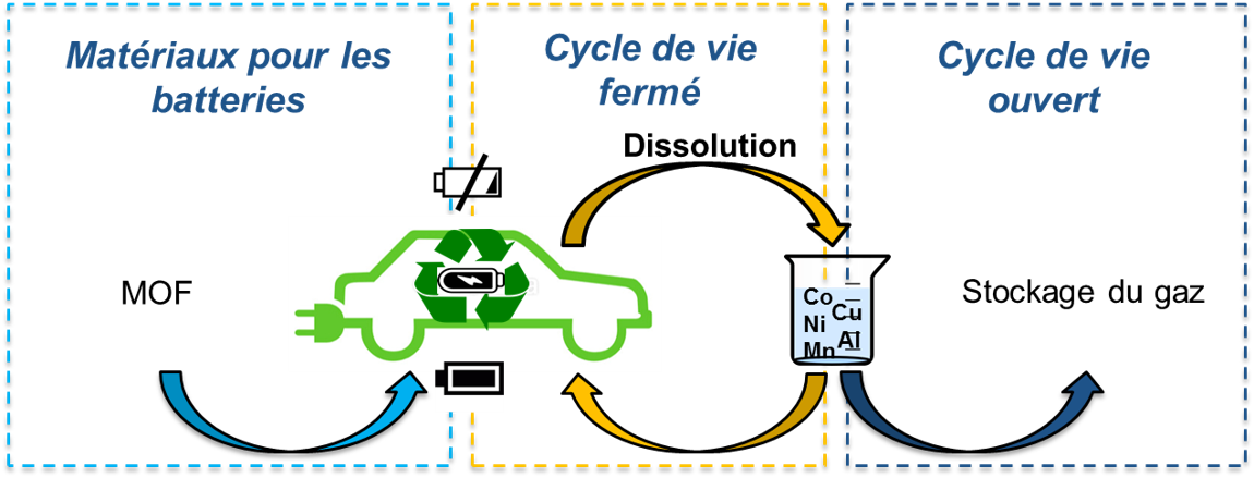 Energy storage and its circular economy represent a major societal challenge for the years to come. In this field, the LHyS team is very interested in the recycling of Li-ion batteries and more particularly to that of the active electrode by an integrated approach based on various hydrometallurgical processes. This cycle includes the fabrication, dissolution and separation of species in a closed cycle mainly based on the use of hybrid materials type MOF (Metal-Organic Frameworks, thesis M. Cognet and T. Riant). All these actions include fundamental and applied studies and involve several national and international external groups (SCARCE project, E. Lagae-Capelle contract).