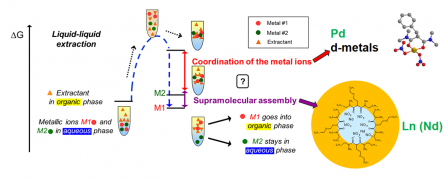 At the fundamental level, the focus is on adaptive separation problems, aiming at a controlled piloting of processes able to treat an incoming flow of variable composition. Following the use of fluorine compounds, Our understanding of the relative importance of strong and weak interactions in the extraction and separation of metals has allowed us to propose an original approach based on the spontaneous demixing of organic phases. The development of adaptive systems has been considered in parallel by an approach based on the implementation of dynamic covalent libraries: contrary to the classical method where a single molecule is designed to extract metal cations under specific conditions, dynamic covalent chemistry allows to induce the generation of extracting species depending on the composition of the medium. In collaboration with the LCS (ISIS), the LHyS team has applied this approach to the extraction of copper (II) nitrate by an organic phase based on a dynamic library of acylhydrazone-like constituents that self-construct and distribute within the biphasic system. The addition of copper(II) cations to this library triggers a modification of its composition and the regulation of ligand molecules driven by the link of cations métalliques.