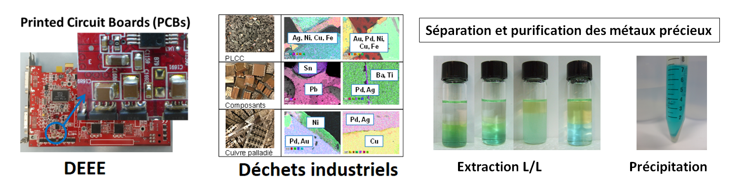 - Recovery and valorization of precious metals (Pd, Au) contained in electronic or industrial waste: